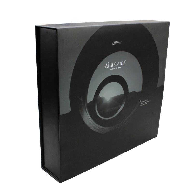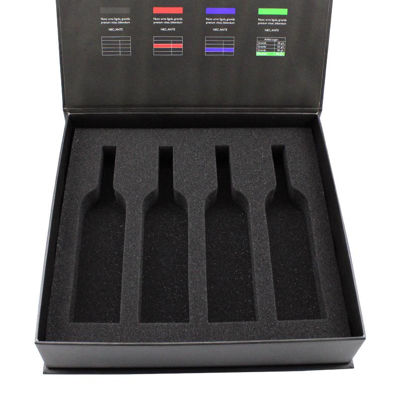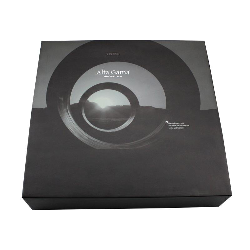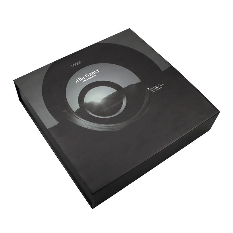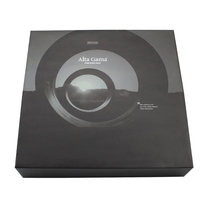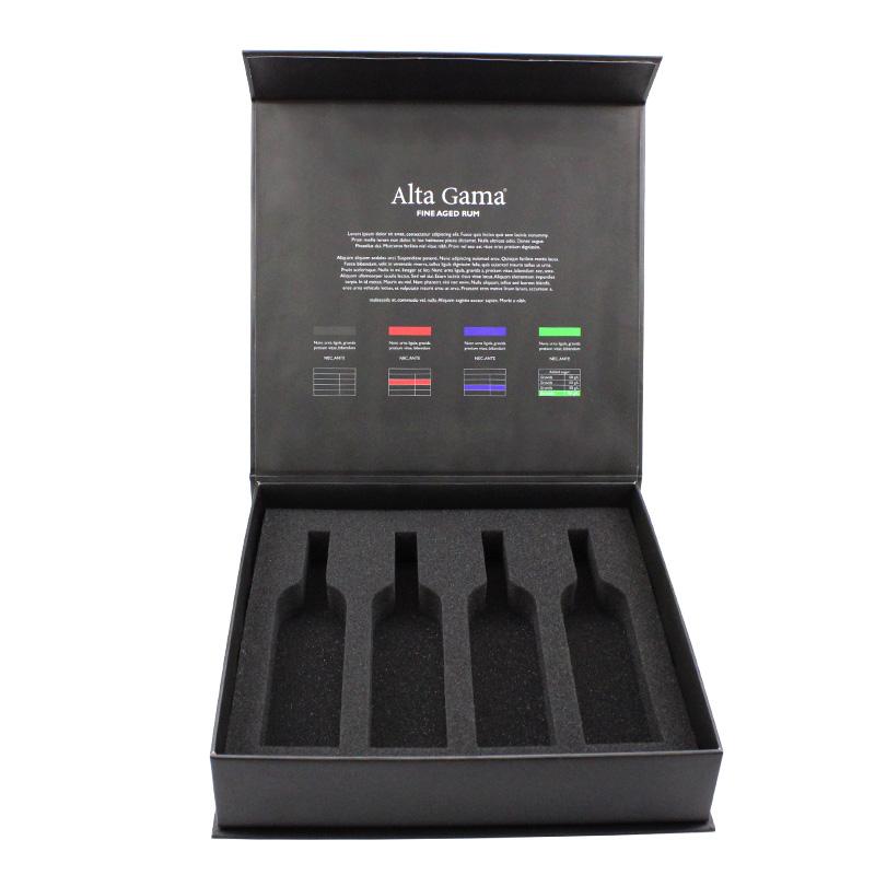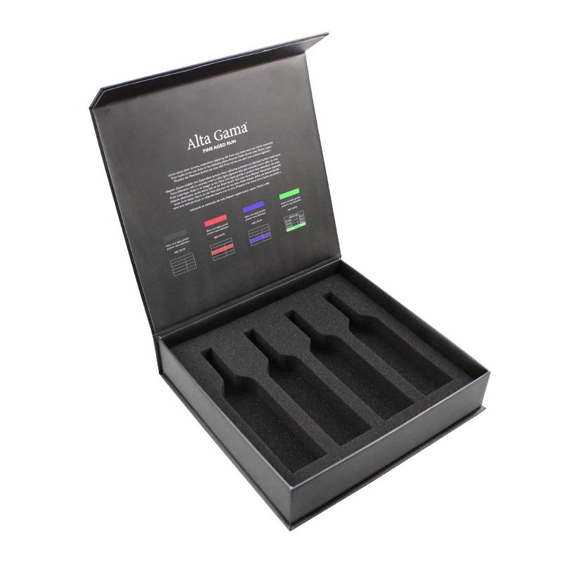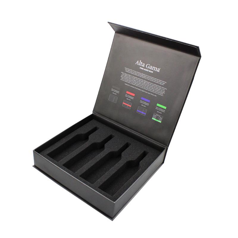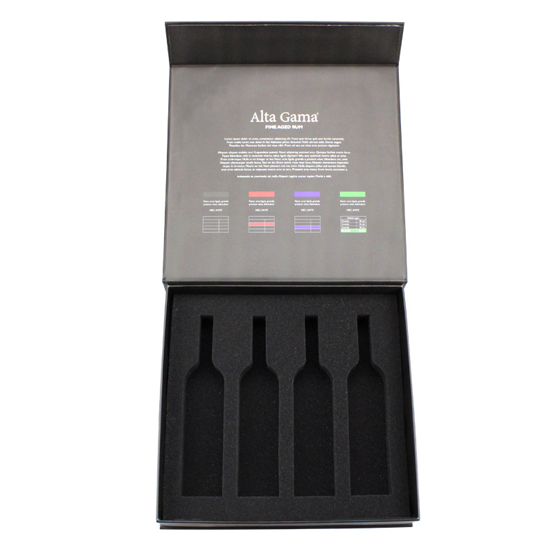 Это черный упаковка бутылок магнитная коробка который сделал из художественной бумаги C2S плотностью 157 г + серого картона толщиной 2 мм, снаружи коробки нанесено выборочное УФ-лакирование на специальный логотип, что придает коробке глянцевый и роскошный вид, внутри коробки вставлена черная губчатая прокладка индивидуальной формы.