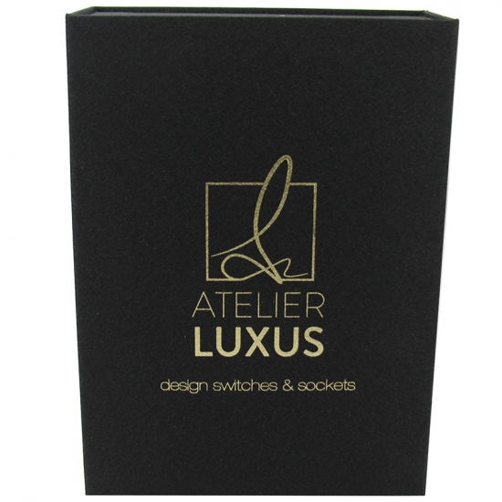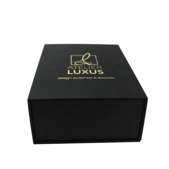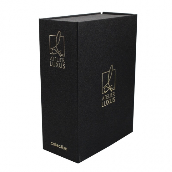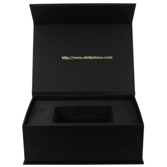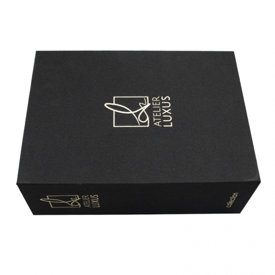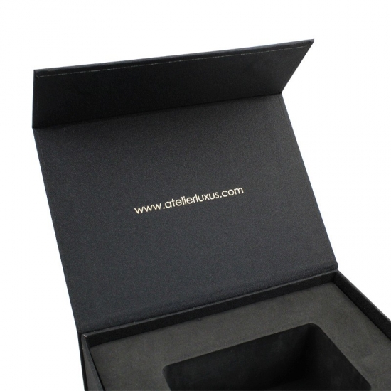 Это черная магнитная коробка с подкладкой из пеноматериала EVA. который сделал на специальной бумаге с тканевым рисунком + серый картон плотностью 1200 г, логотип внутри и снаружи выполнен тиснением золотой фольгой.