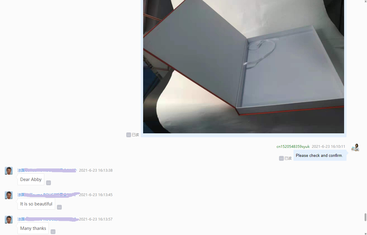 Наконец он согласился с нашей идеей. После согласования с ним дизайна печати, образец коробки был готов за 3 дня. Мы отправили вам фотографии и видео для ознакомления. Ему очень понравилось.