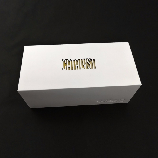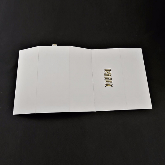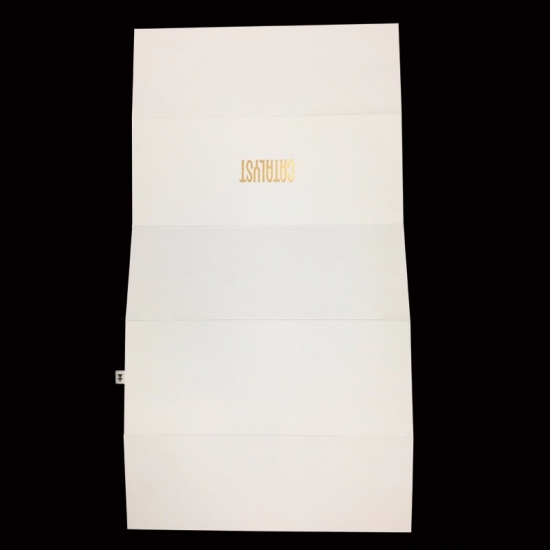 Изготовлено из специальной бумаги + 2 мм серого картона, снаружи без печати, внутри полная печать плашечными цветами и тиснение логотипа, горячее тиснение золотом.