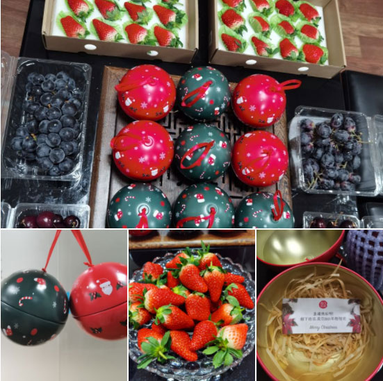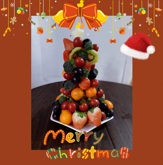 В этот особенный день наша команда Сэнди решила сделать особенную рождественскую ёлку из фруктов. Надеясь, что она принесёт здоровье, счастье и успех тем, кого она любит. После двух дней упорного труда ей удалось сделать фруктовую рождественскую ёлку.