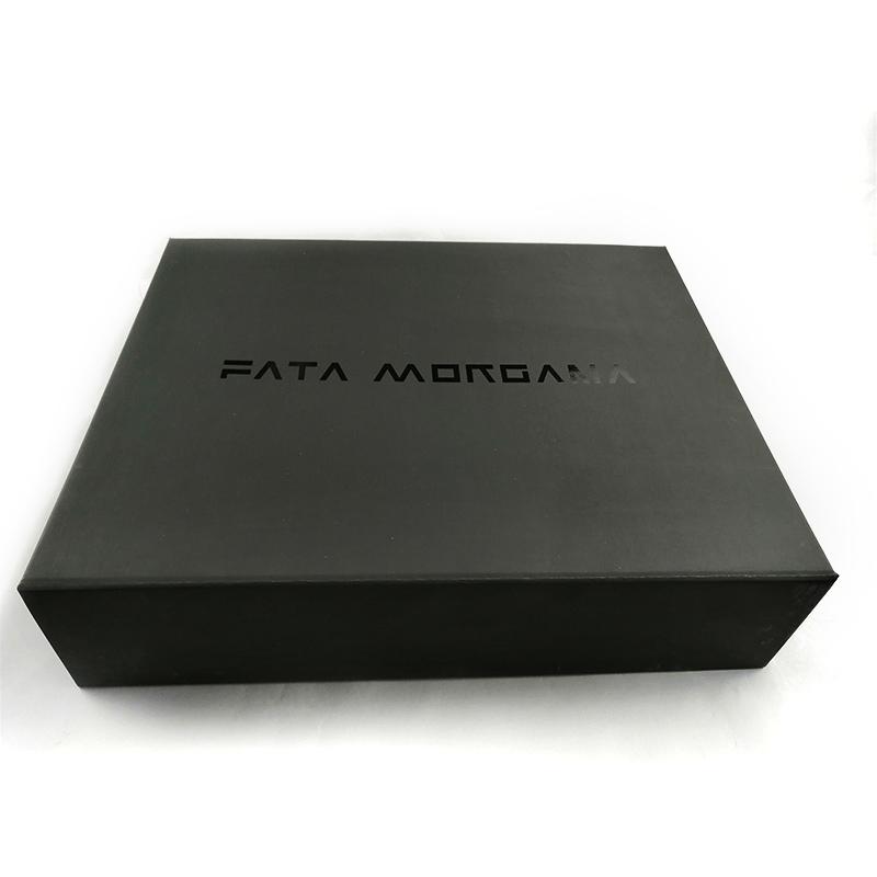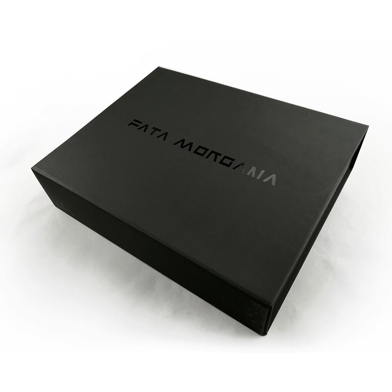 Это складная плоская подарочная коробка с магнитной застежкой. который сделал из художественной бумаги C2S плотностью 157 г + серого картона плотностью 1200 г, логотип нанесен методом УФ-лакирования, что делает коробку более роскошной, элегантной и высококлассной.