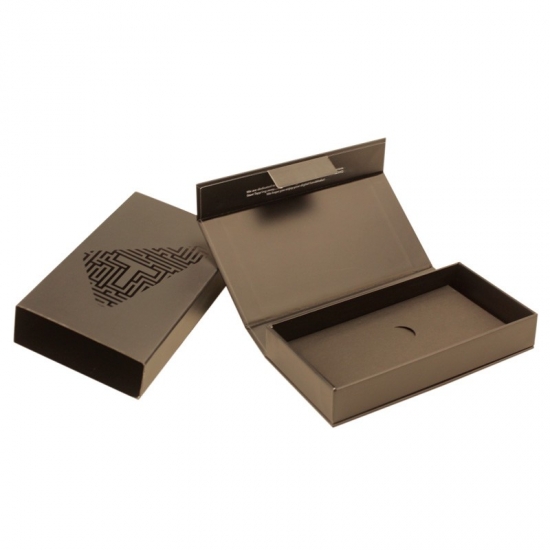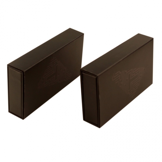 Маленькая подарочная коробка с магнитной застежкой изготовлена из художественной бумаги C2S плотностью 157 г/м², ламинированной серым картоном толщиной 1,5 мм, с выборочным УФ-лакированием и матовой ламинацией.
