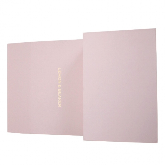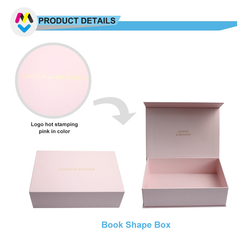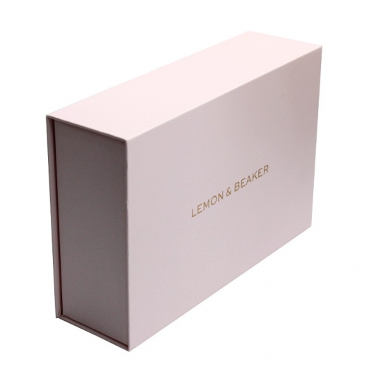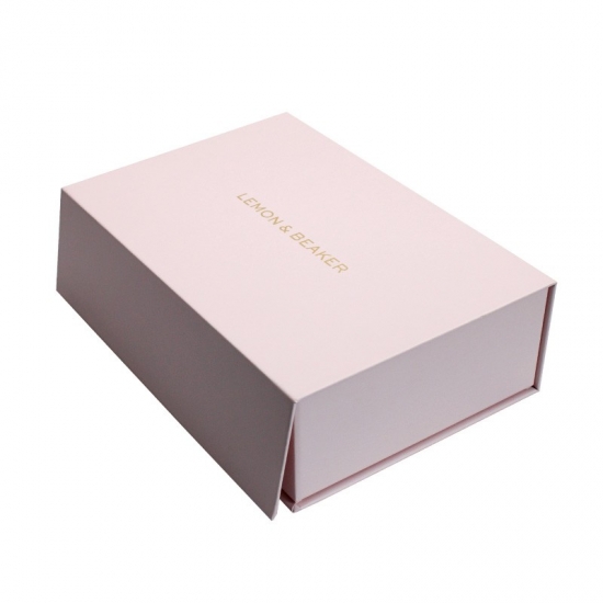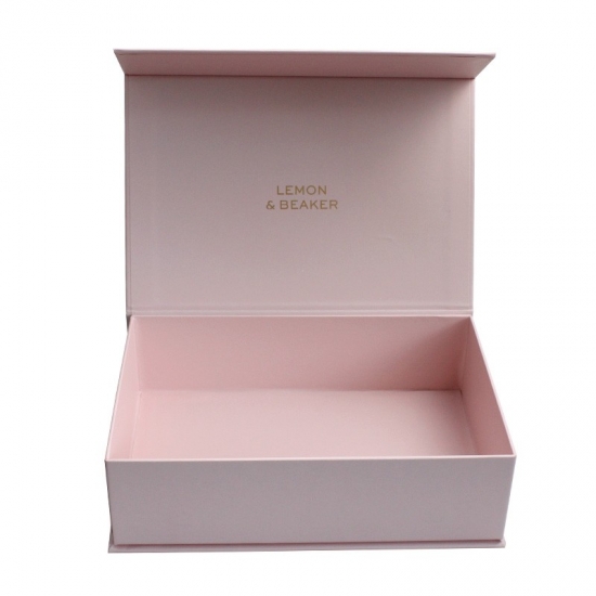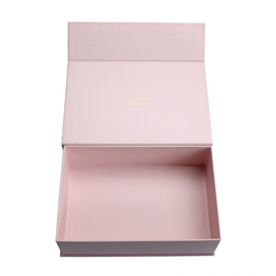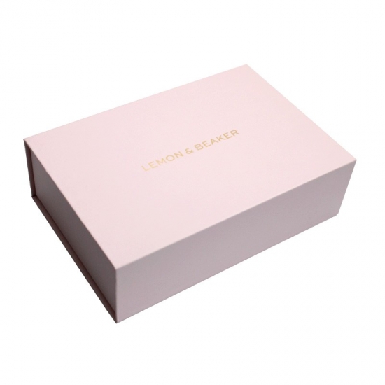 Магнитная подарочная коробка розового цвета изготовлена из художественной бумаги C2S плотностью 157 г/м², ламинированной серым картоном толщиной 2 мм, матовой ламинацией и горячим тиснением розового цвета.
