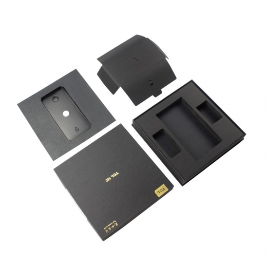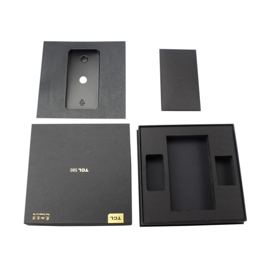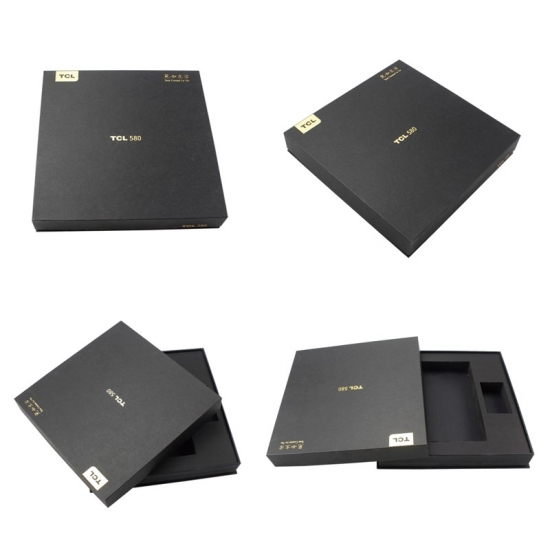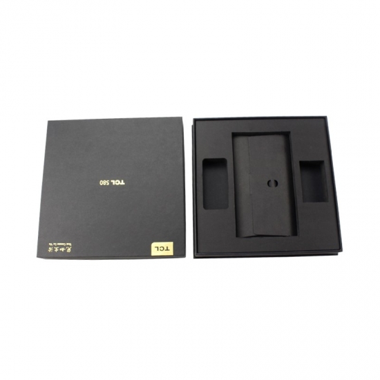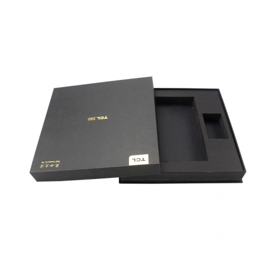 Это большие подарочные коробки для мобильных телефонов из картона и бумаги с крышками, изготовленные из черного картона + серого картона плотностью 1200 г, с индивидуальным логотипом, тиснением золотой фольгой, внутри коробки имеется прочная черная вставка-разделитель из вспененного ЭВА для хранения телефона и разделения с аксессуарами.