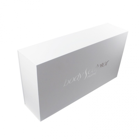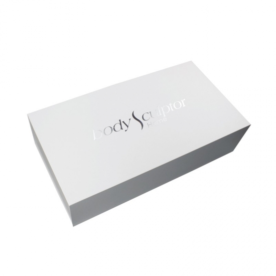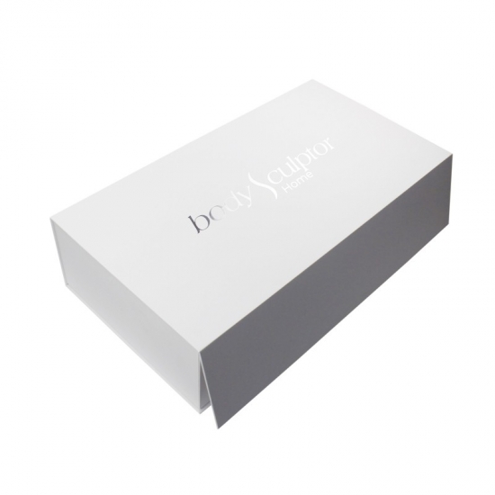 Белая персонализированная магнитная подарочная коробка изготовлена из художественной бумаги C2S плотностью 157 г/м², ламинированной серым картоном толщиной 2 мм с основой из перламутрового вспененного хлопка. Возможна поставка по индивидуальному заказу любого размера, цвета и логотипа. Отделка поверхности — матовая ламинация с горячим тиснением. Размер 53,5*33*14 см.