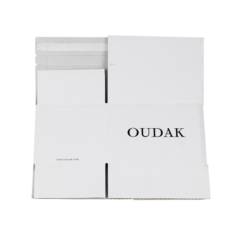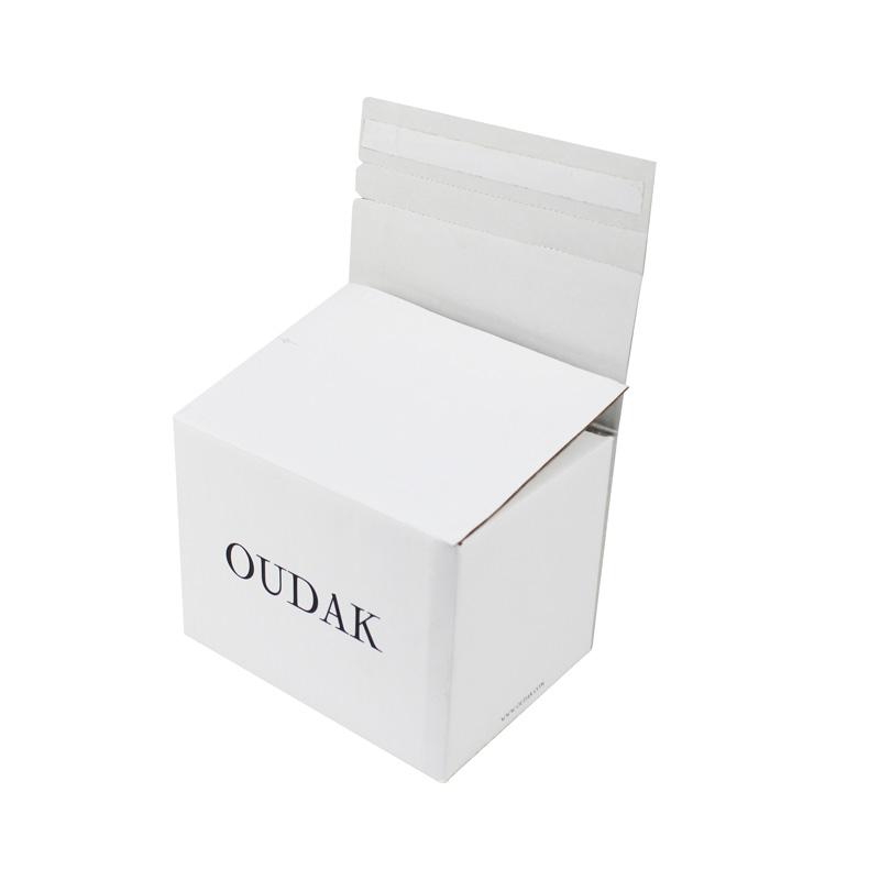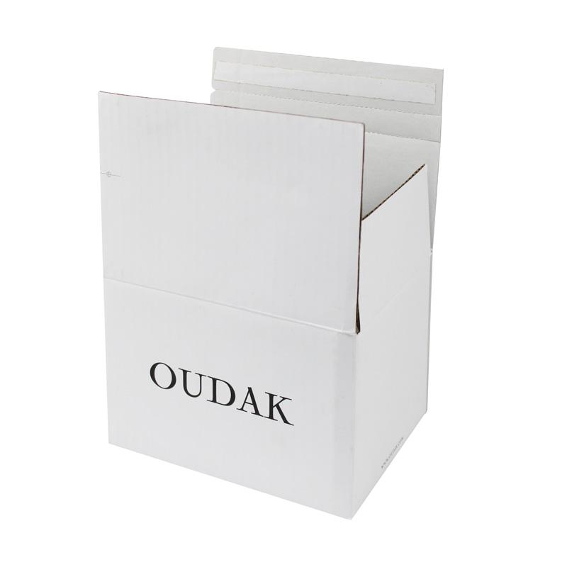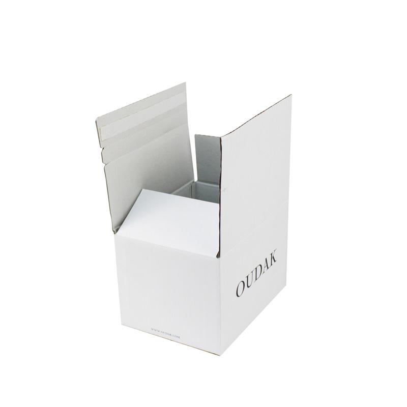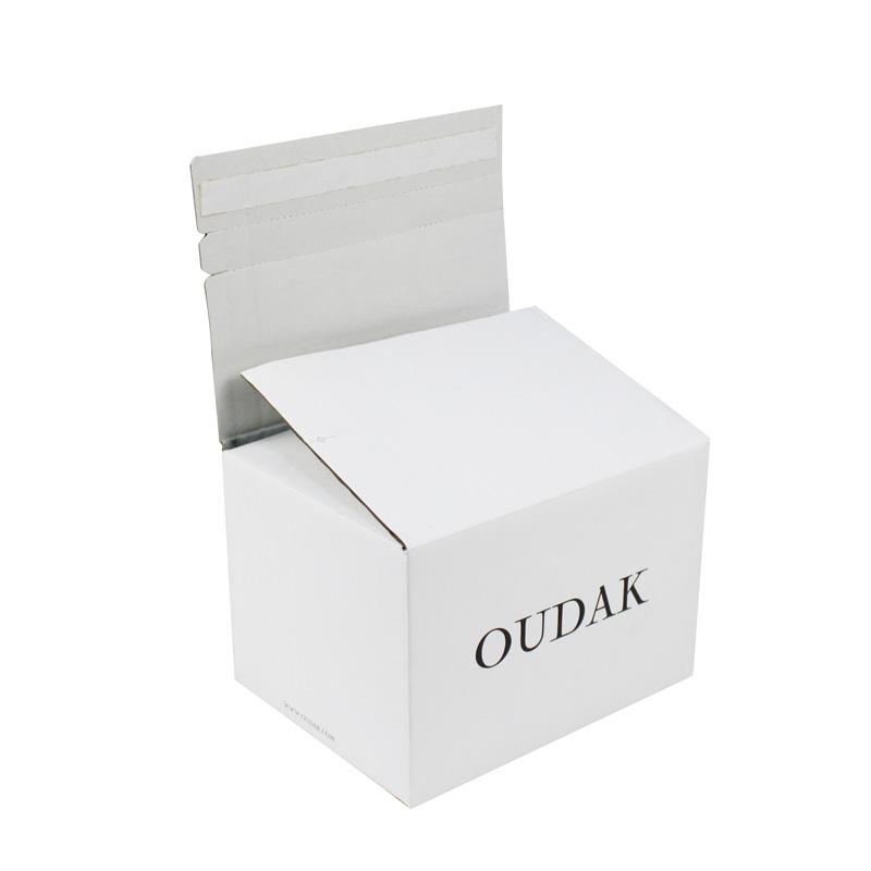Изысканный Почтовые ящики Easy Seal Изготовлена из CCNB плотностью 300 г/м², ламинирована трёхслойным белым гофрокартоном. Снаружи логотип напечатан чёрным цветом на матовой поверхности, внутри — обычный белый картон с двусторонней клейкой лентой. Коробка легко закрывается самоклеящейся лентой и легко открывается благодаря перфорации.
