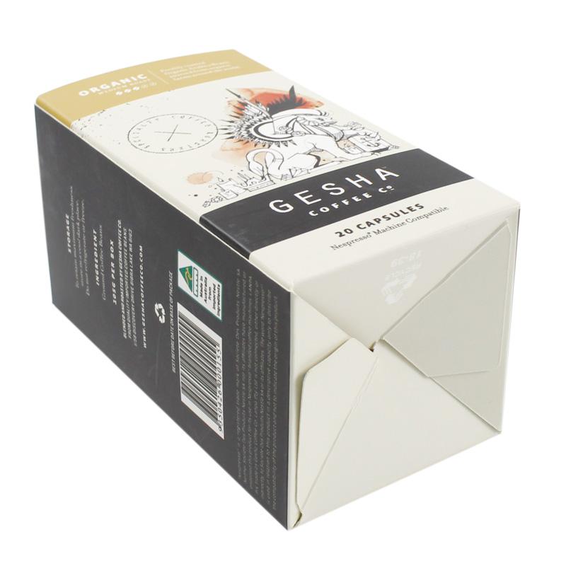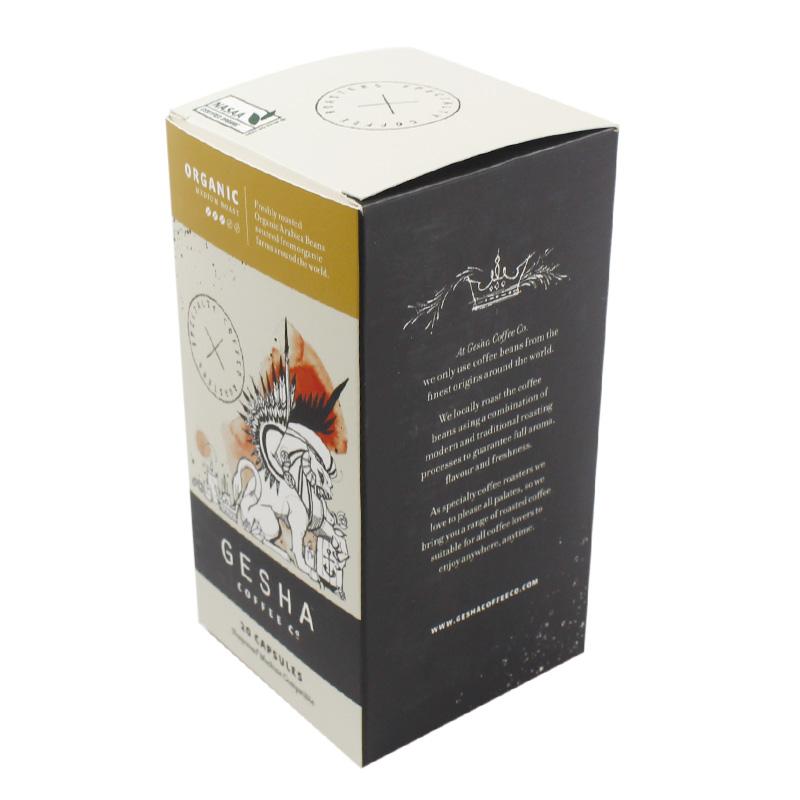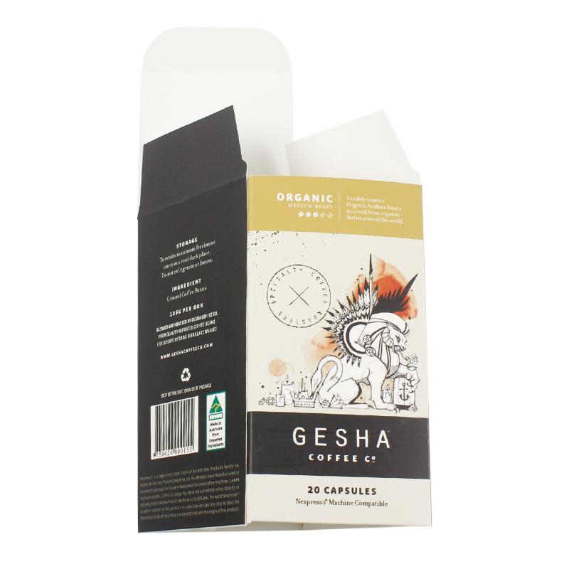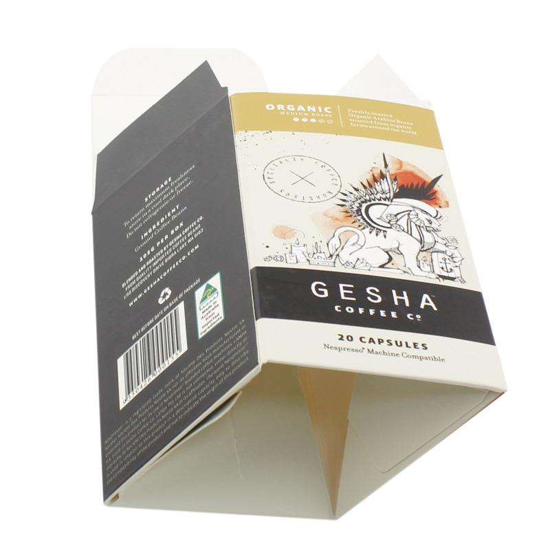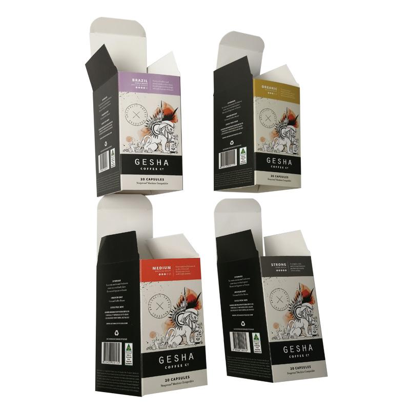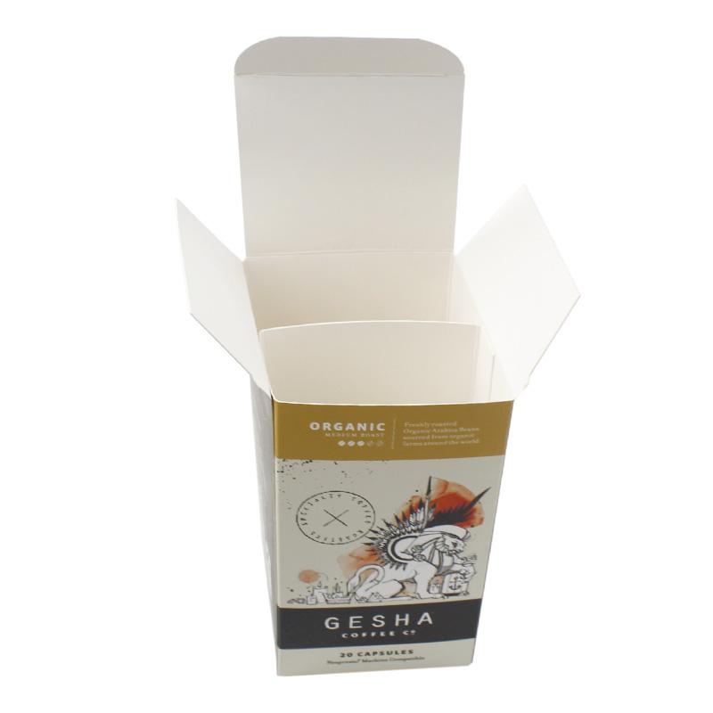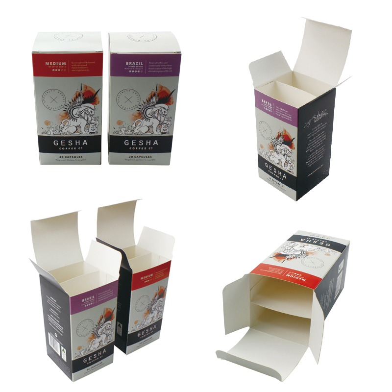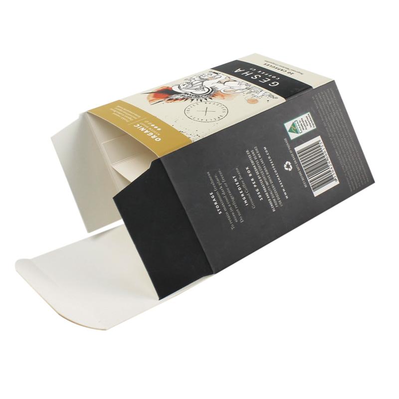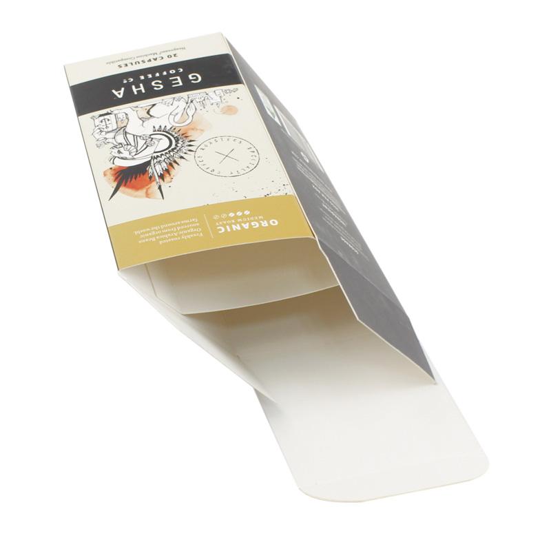 Эта коробка с автодном изготовлена из белого картона плотностью 350 г/м² с печатью в цветовой гамме CMYK4C+Pantone Grey и матовым лаком. Она используется для упаковки кофе-компрессов. Каждый сувенир имеет свой дизайн печати. Такие коробки из мягкого картона обычно используются для упаковки небольших товаров, таких как лекарства, косметические флаконы и т. д.
