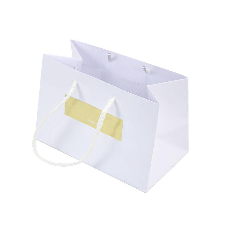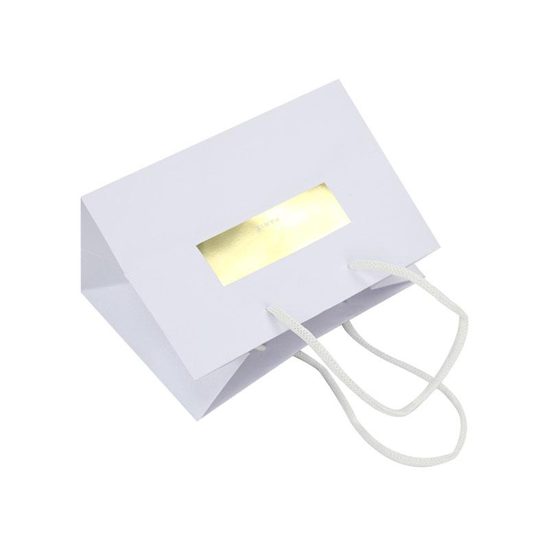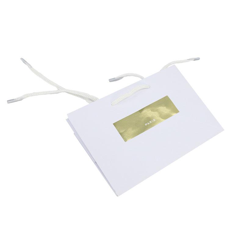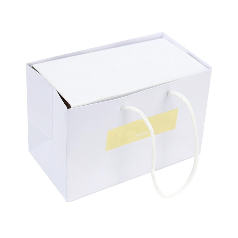 Материал пакета: белый картон плотностью 250 г/м² + белая веревочная ручка с пластиковым наконечником