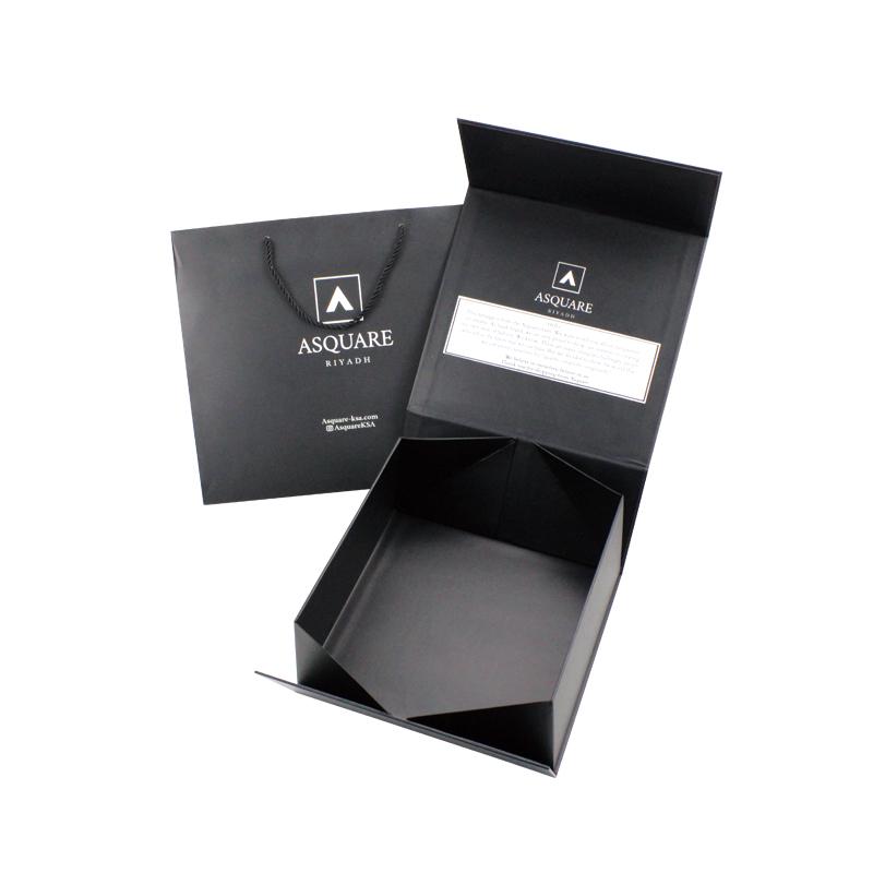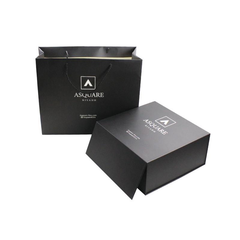 Классический черные складные коробки Изготовлены из художественной бумаги плотностью 157 г/м², ламинированной высококачественным жёстким картоном толщиной 2 мм. Полностью чёрная печать и антицарапающаяся плёнка по всей поверхности коробки. В качестве подарочной упаковки мы также можем напечатать бумажный подарочный пакет, подходящий к подарочным коробкам.
