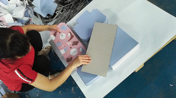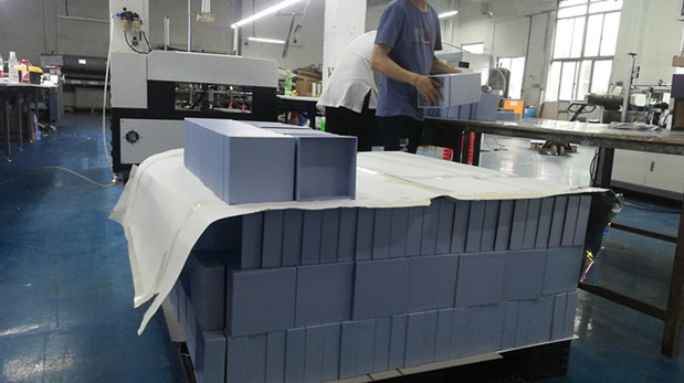 После печати и нанесения плёнки бумага будет высечена по форме коробки. Наши опытные мастера вручную с помощью машины оформили бумагу на высококачественный жёсткий картон.
