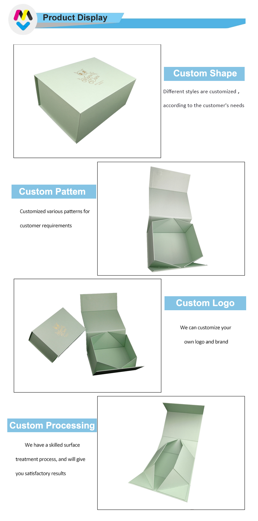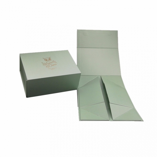 Это зеленый цвет. складные бумажные коробки который сделал из художественной бумаги C2S плотностью 157 г + серого картона плотностью 1200 г, полноцветная печать на внешней и внутренней стороне коробки с логотипом, тисненным золотой фольгой.