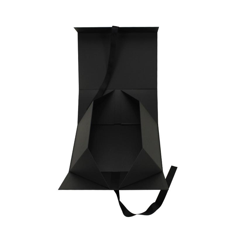 Изысканный Складные коробки для обуви Изготовлена из чёрной бумаги плотностью 120 г/м², ламинированной жёстким картоном толщиной 2 мм. Полностью чёрная коробка с чёрной лентой. Нанесение логотипа методом выборочного УФ-лакирования. Некоторые также предпочитают тиснение золотой фольгой и конгревное тиснение на чёрных складных коробках. Доступны любые варианты отделки по индивидуальному заказу.