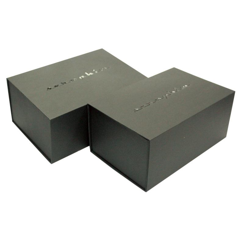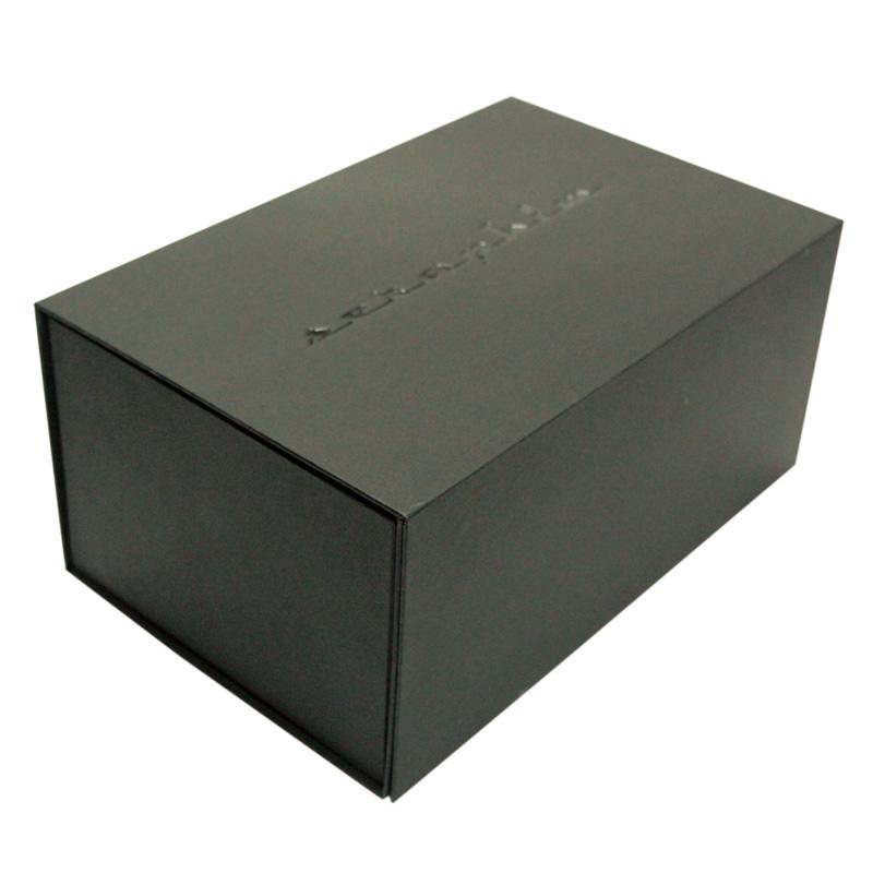 Это складные большие магнитные упаковочные коробки который сделал из специальной черной бумаги + серый картон плотностью 1200 г, логотип на крышке тиснением + УФ-лакирование. Мы можем изготовить коробку по индивидуальному размеру по вашему запросу.