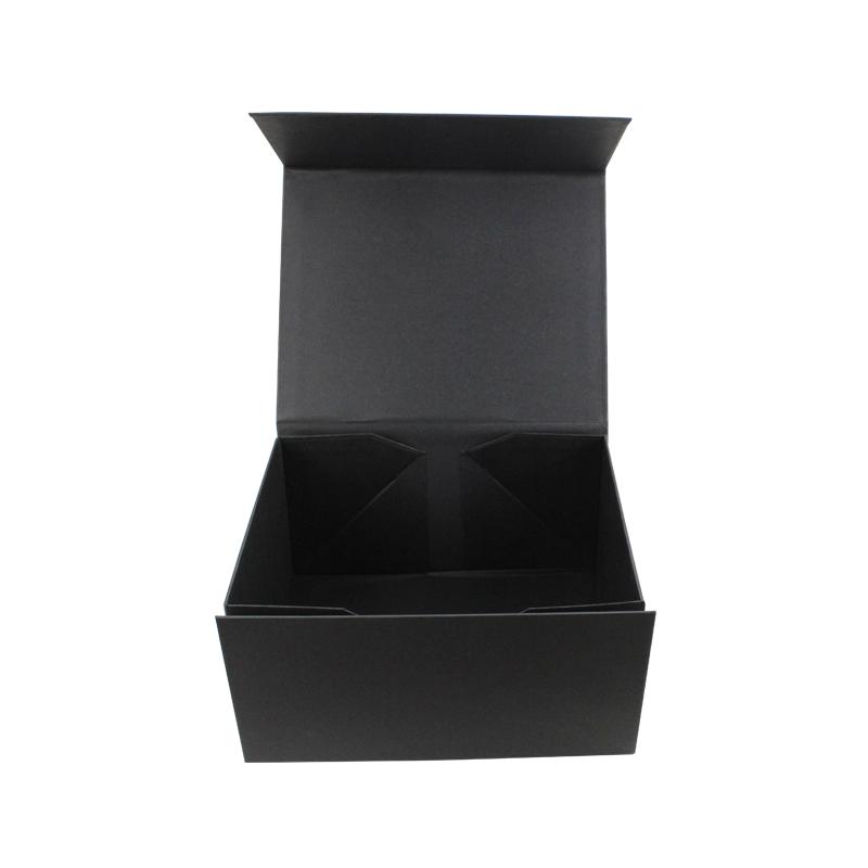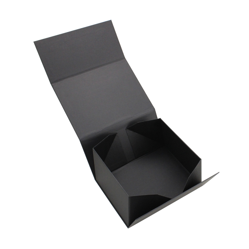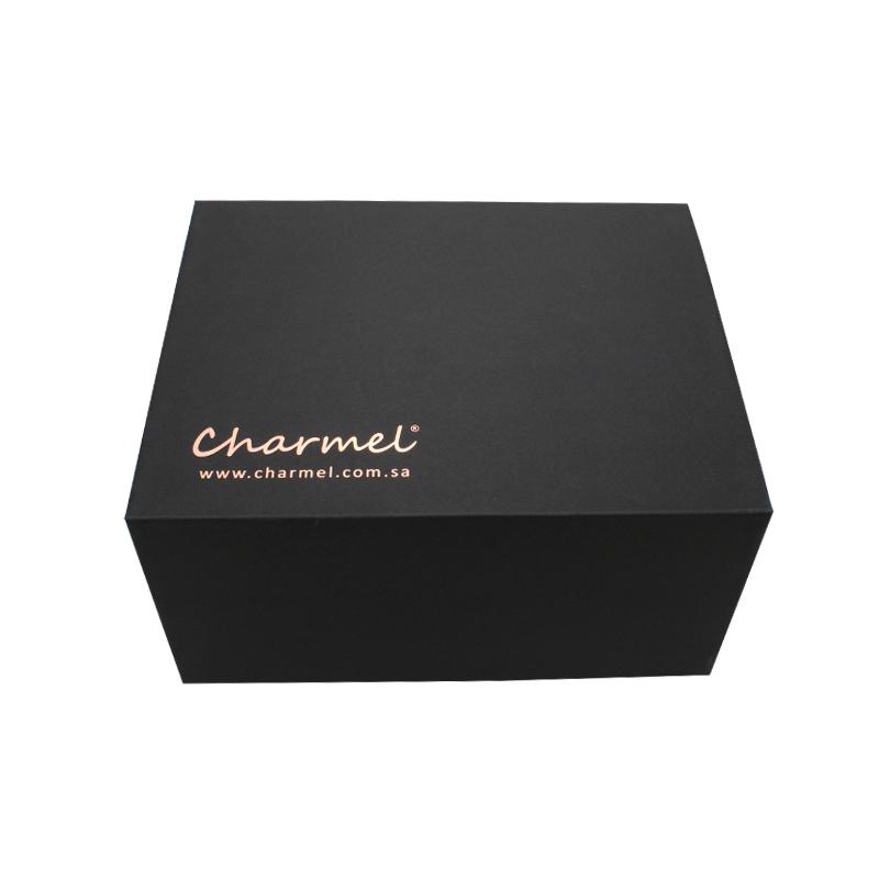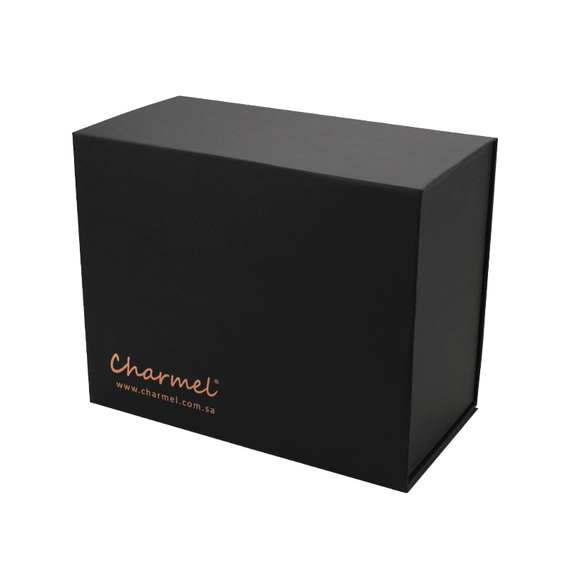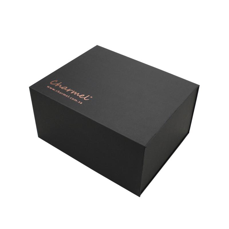 Это черный складные магнитные упаковочные коробки который сделал из специальной черной бумаги + серого картона плотностью 1200 г, логотип на углу верхней крышки — тиснение фольгой розового золота. Мы можем изготовить индивидуальный размер и логотип по вашему запросу.