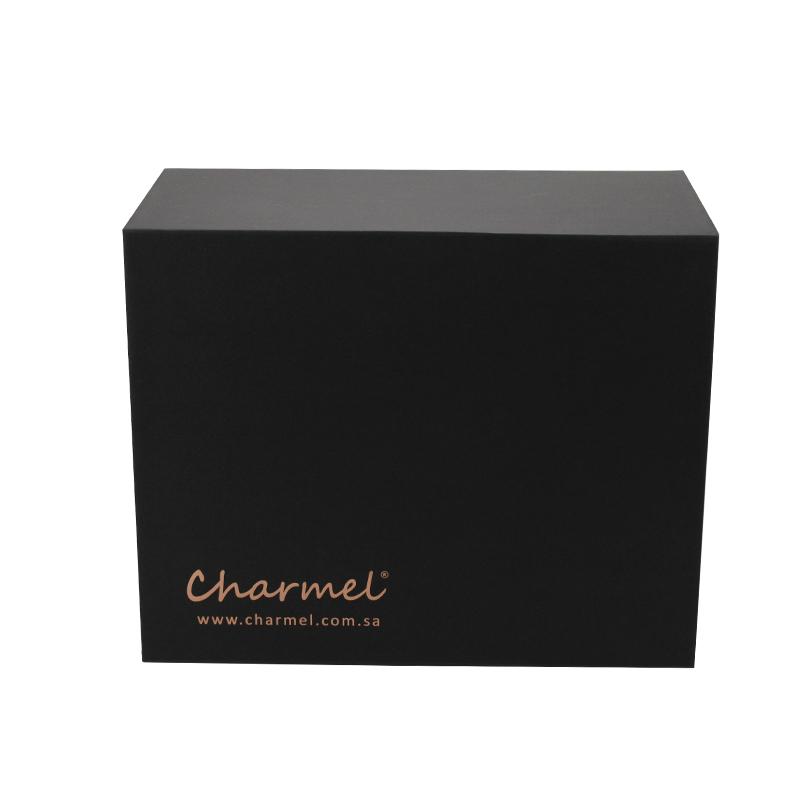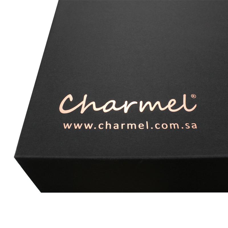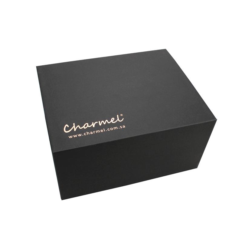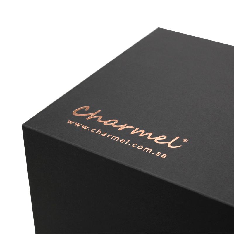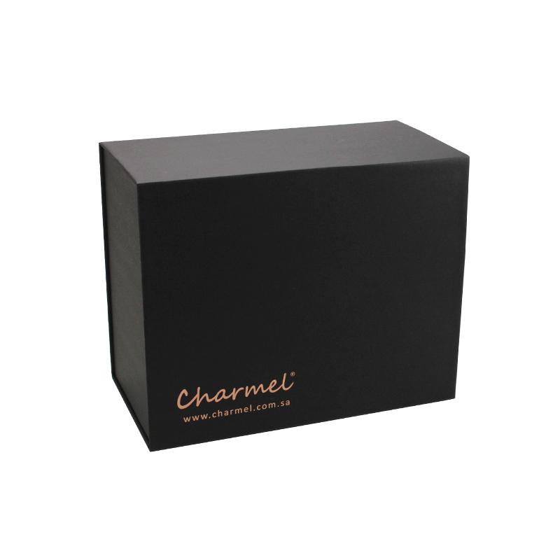 Это черный складные магнитные упаковочные коробки который сделал из специальной черной бумаги + серого картона плотностью 1200 г, логотип на углу верхней крышки — тиснение фольгой розового золота. Мы можем изготовить индивидуальный размер и логотип по вашему запросу.