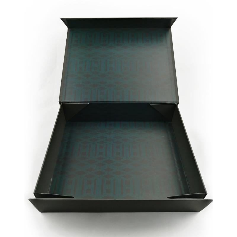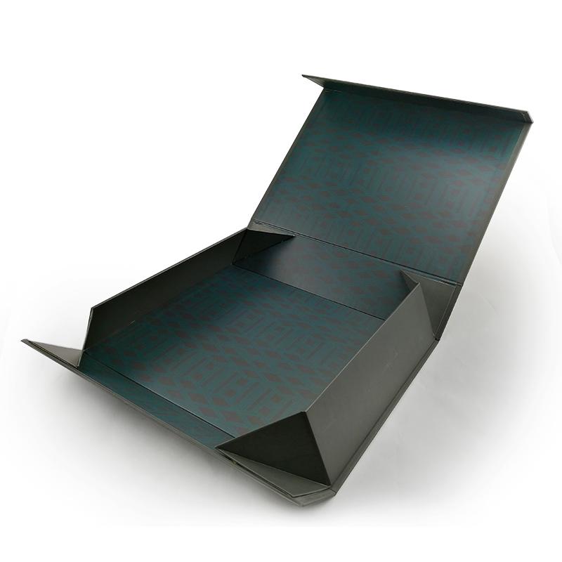Это зеленый цвет. черные складные подарочные коробки который сделал из художественной бумаги C2S плотностью 157 г + серого картона плотностью 1200 г, полноцветная черная печать на внешней и внутренней стороне коробки с логотипом, нанесенным УФ-лаком.