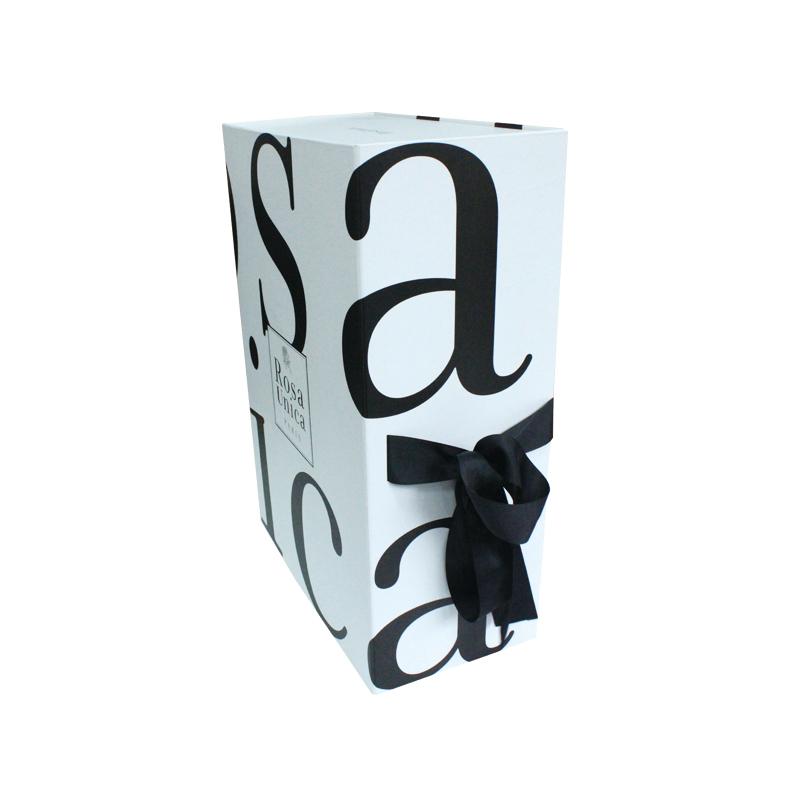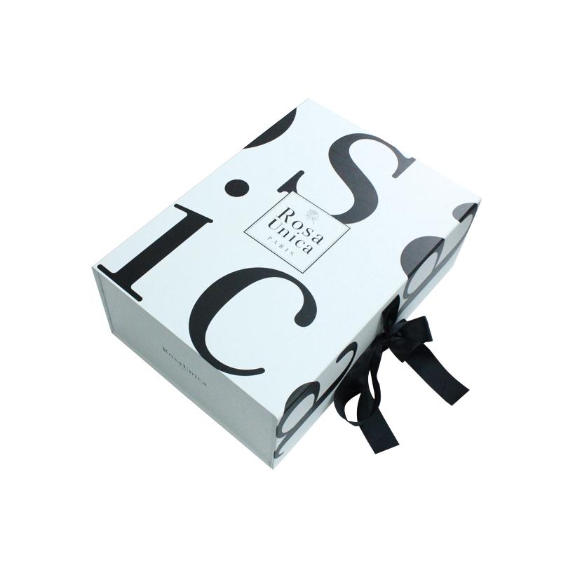 Это Складная подарочная коробка формата А4 с лентой С чёрным логотипом, напечатанным на белом фоне с лентой. Отличный дизайн упаковки.