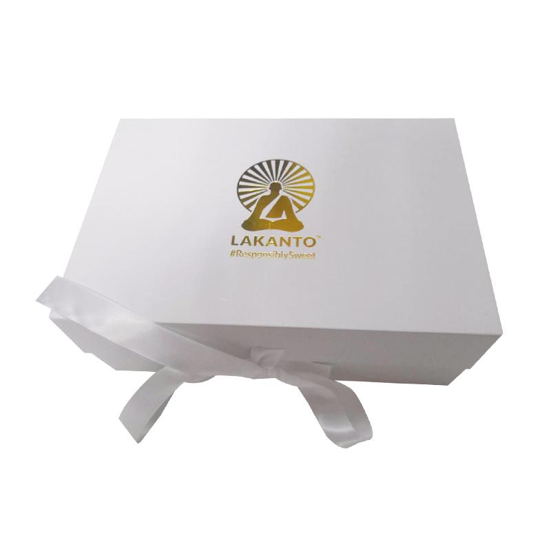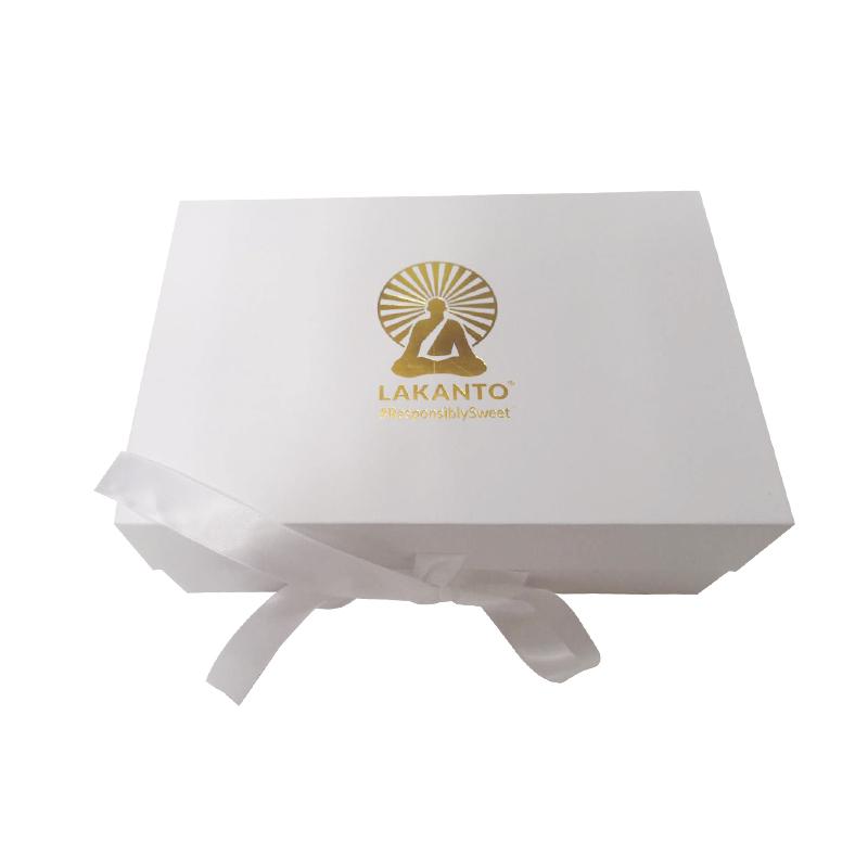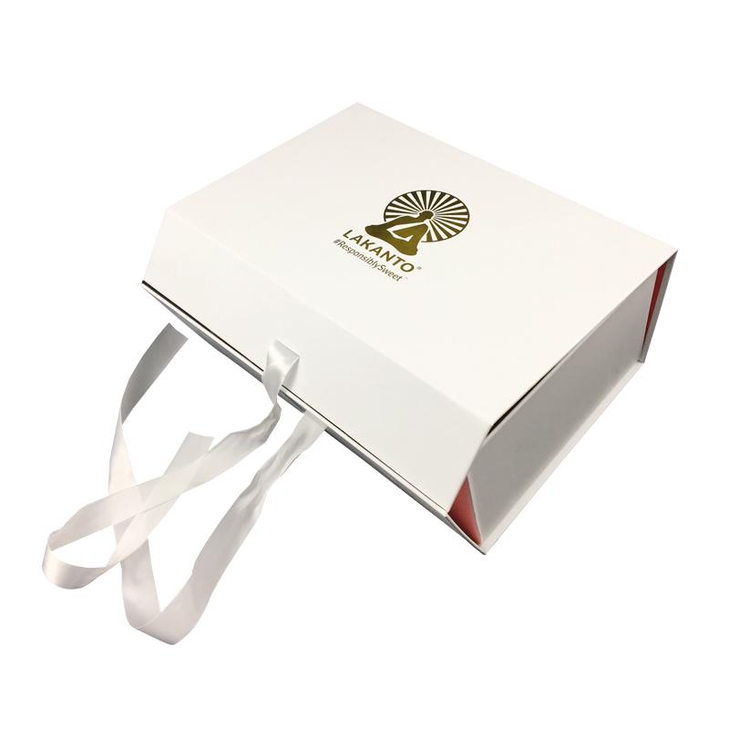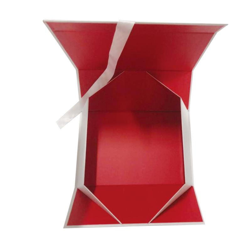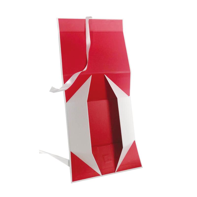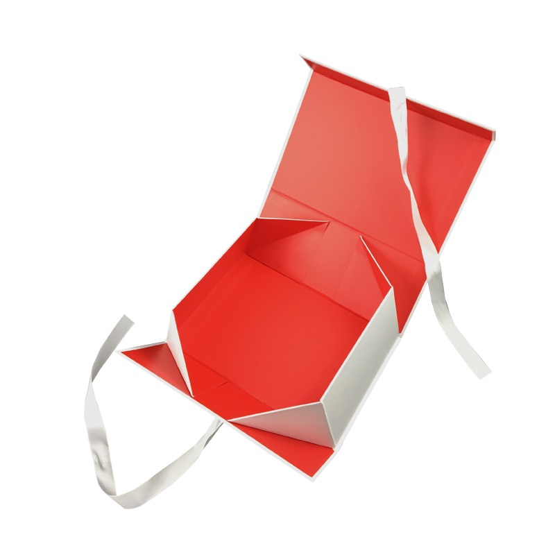Это белый складная подарочная коробка с лентой с тиснением фольгой снаружи, а внутренняя часть красная, чтобы ваша упаковка больше не была однообразной