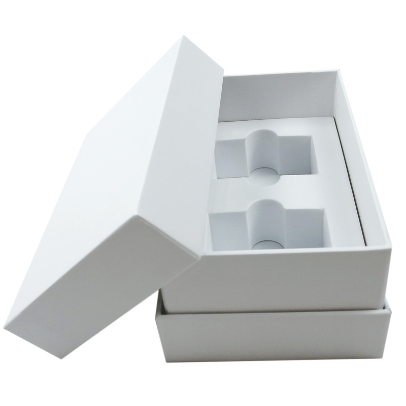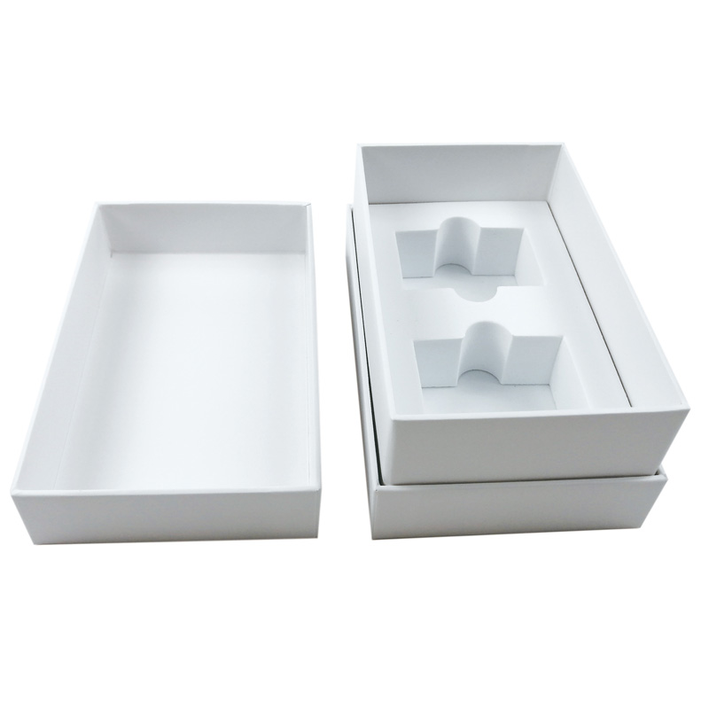 Это белый картон с крышкой коробка который сделал из художественной бумаги C2S плотностью 157 г + серого картона плотностью 1200 г, основание с манжетой, внутри коробки имеется белая вставка-прокладка EVA индивидуальной формы.