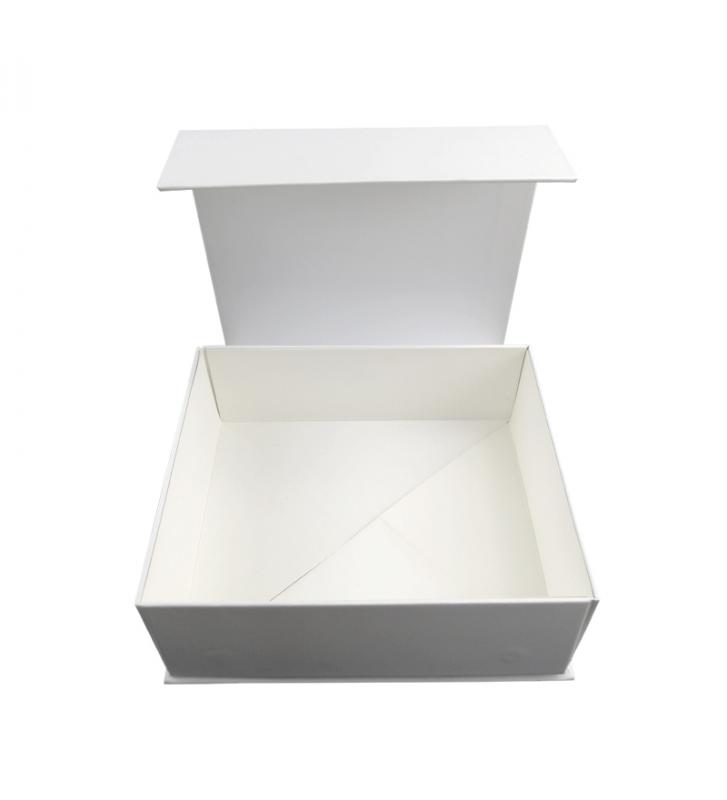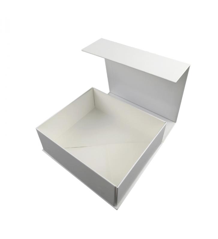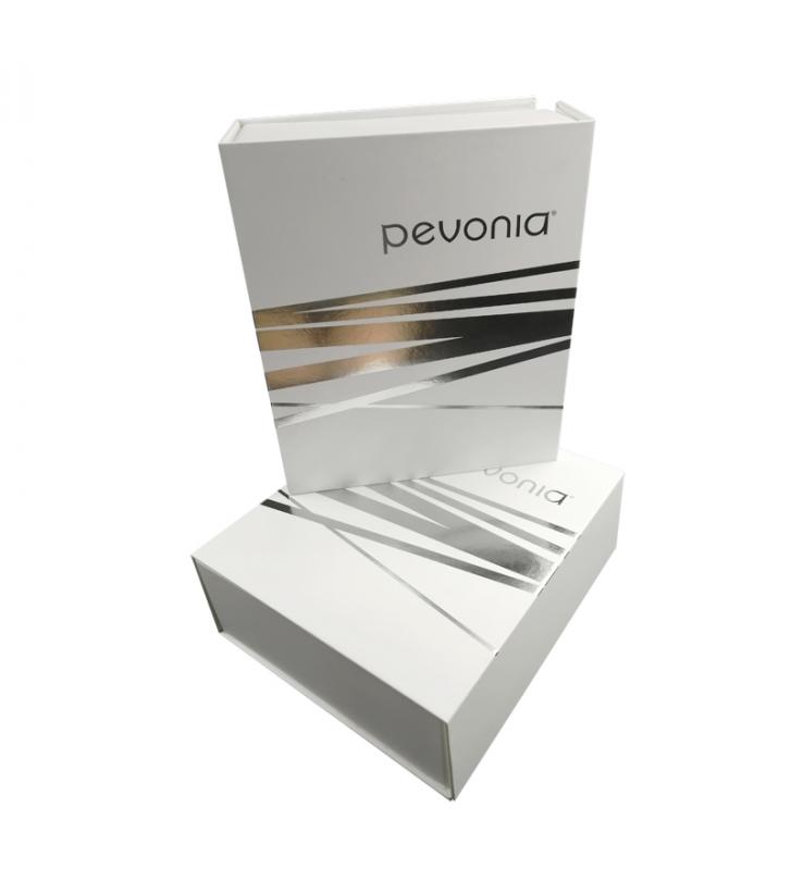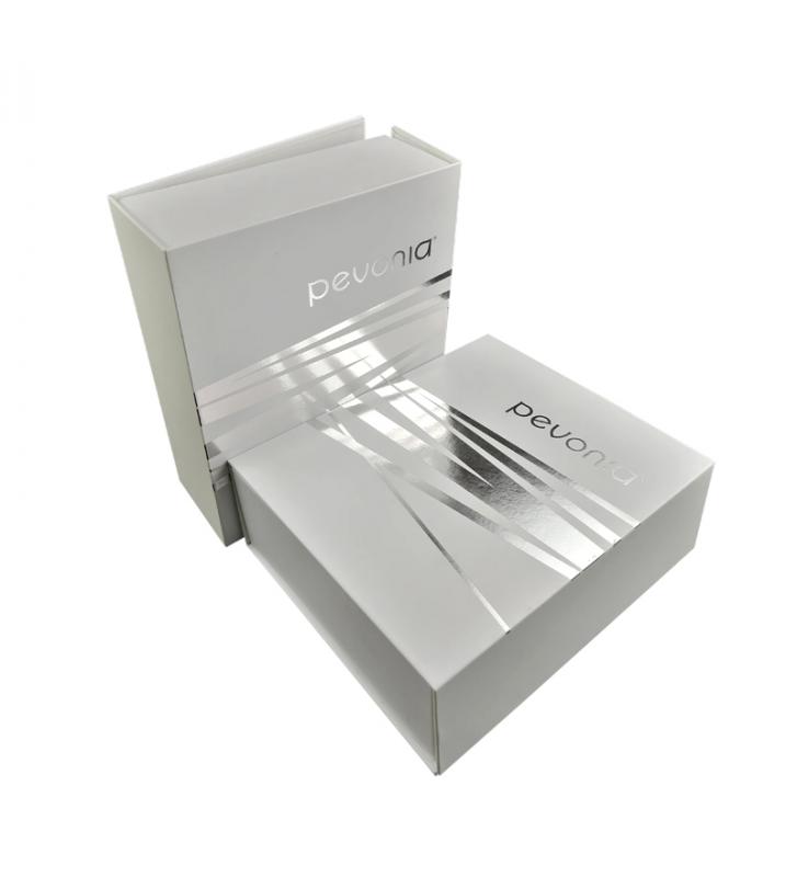 Изготовлена из мелованной художественной бумаги плотностью 157 г + серого картона толщиной 2 мм, с логотипом, нанесенным методом горячего тиснения серебром. Это необычная складная коробка, состоящая из двух частей, подходящая для коробок с большей высотой.