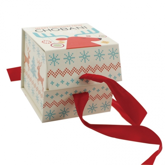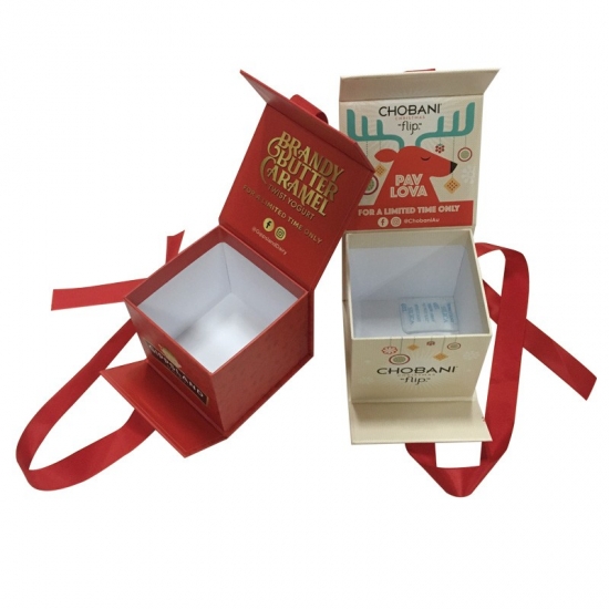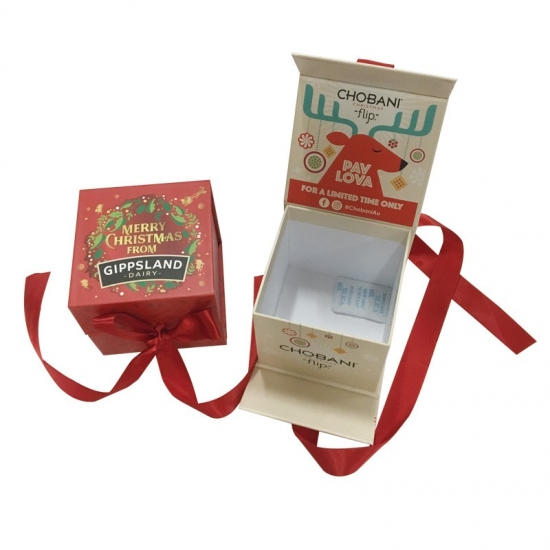Это небольшая магнитная плоская упаковка рождественских подарочных коробок. который сделал из художественной бумаги C2S плотностью 157 г + серого картона плотностью 1200 г красная лента.