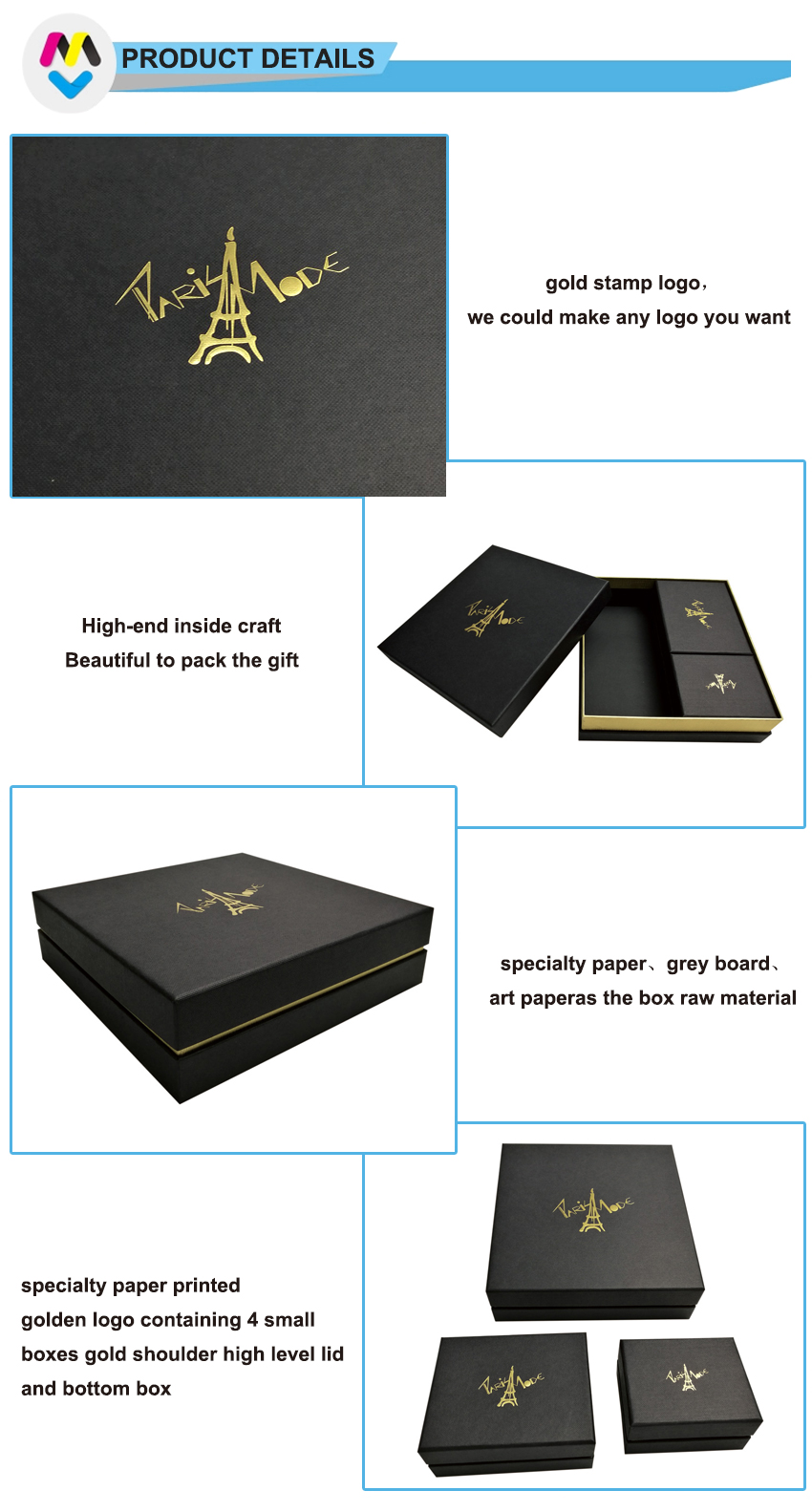 Большая коробка с четырьмя маленькими коробками того же дизайна в комплекте. Эта коробка с золотым плечом, изготовленная из специальной бумаги, — роскошный и классический вариант. Кроме того, золотой логотип делает коробку ещё более изысканной.