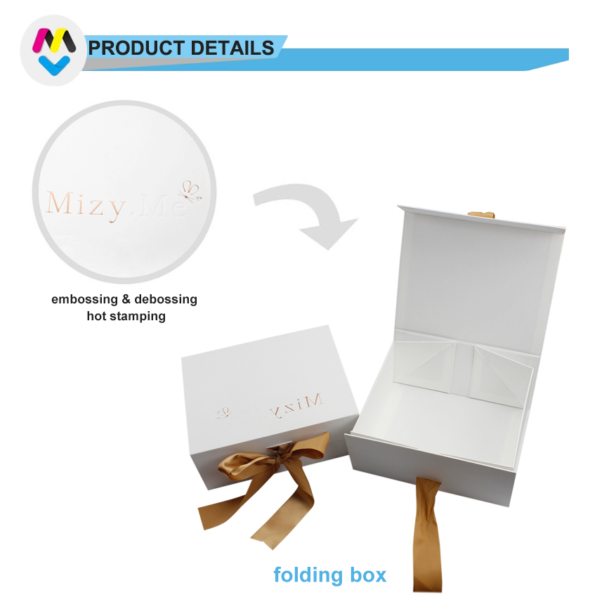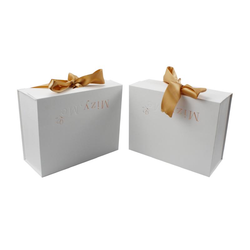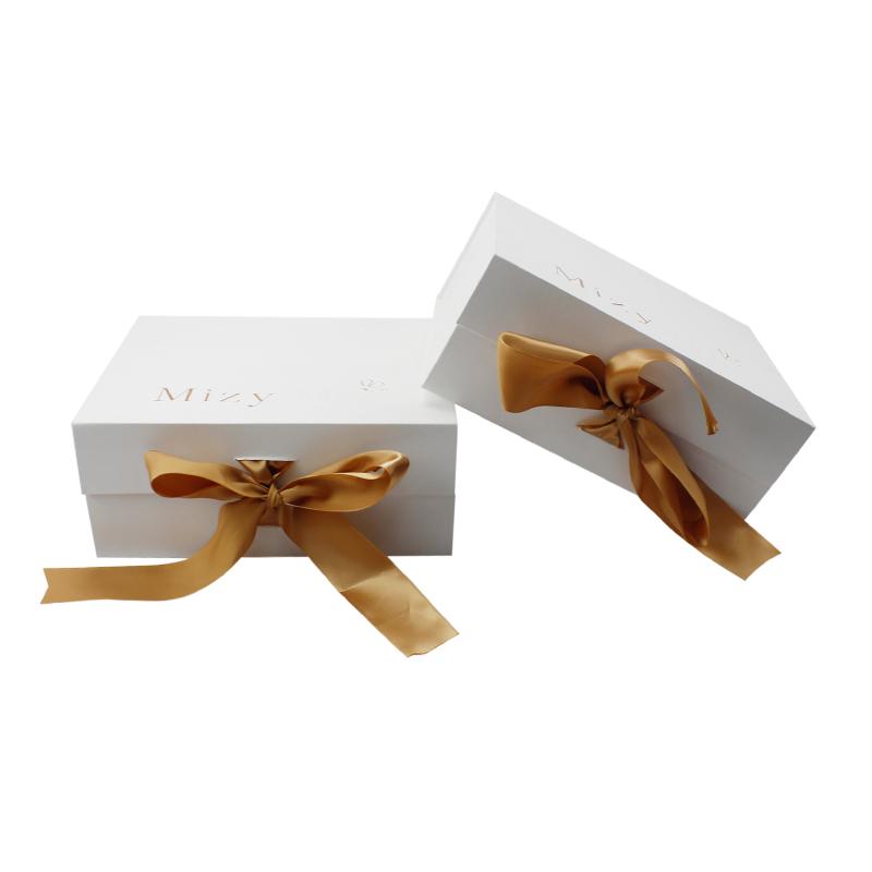 Это уникальный и элегантный белая подарочная коробка с магнитной крышкой который сделал из специальной белой бумаги + серый картон плотностью 1200 г, логотип из золотой фольги, отпечатанный и выдавленный на верхней части крышки, который сочетается с лентой золотого цвета.