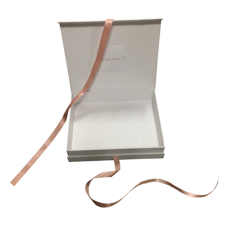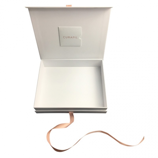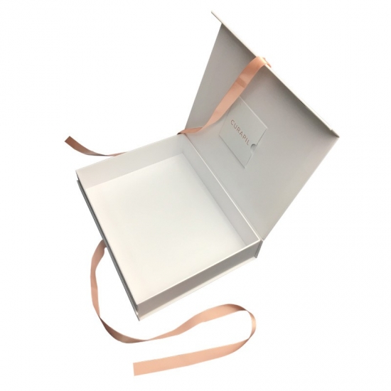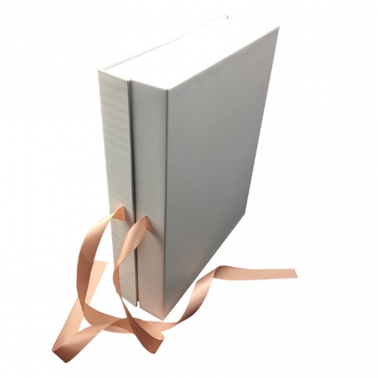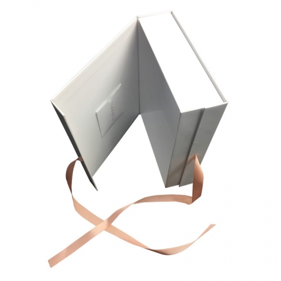 Это белый магнитная подарочная коробка с лентой который сделал из художественной бумаги C2S плотностью 157 г + серого картона толщиной 2 мм, внешняя поверхность коробки покрыта УФ-лаком, что придает ей глянцевый и роскошный вид, внутри крышки прикреплен небольшой конверт для вставки открытки.
