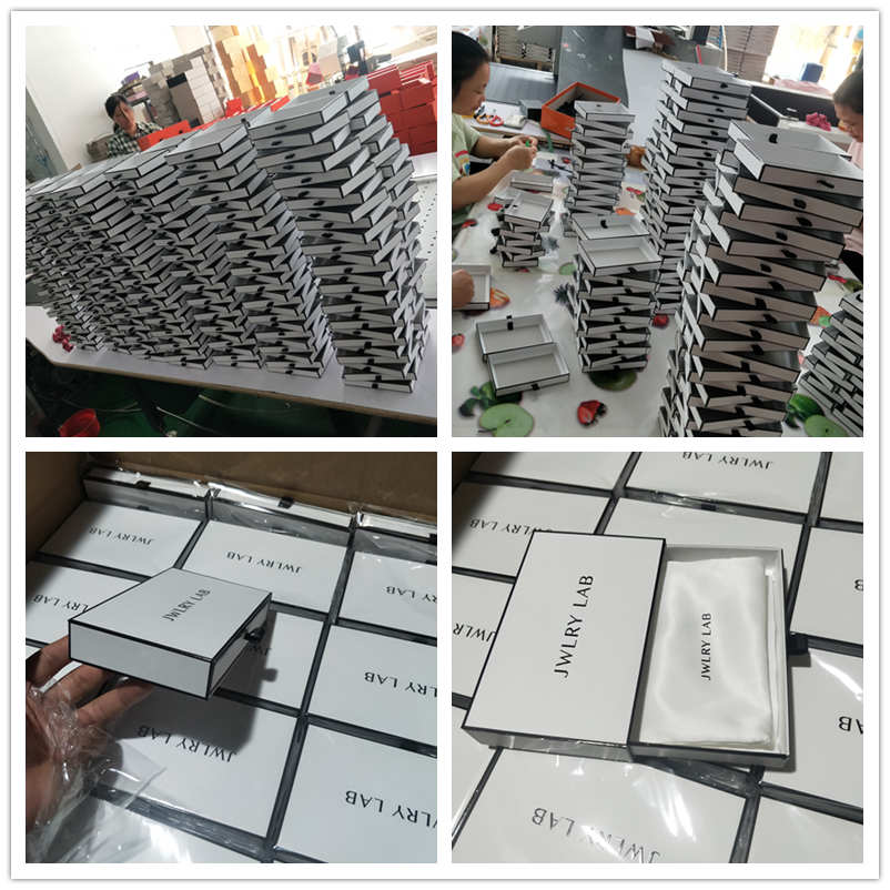 Индивидуальная выдвижная коробка , изготовлена из художественной бумаги плотностью 120 г/м², оклеена плотным картоном премиум-класса плотностью 1200 г/м², с логотипом черного цвета, в черной рамке, сатиновый вкладыш для мешочка упаковка ювелирных изделий